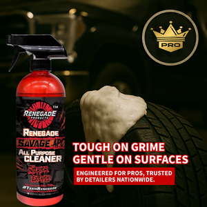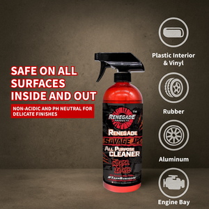 Renegade Savage APC is a robust all-purpose cleaner engineered to clean the interior and exterior of your vehicle. For interior use, this product is best suited for spot cleaning areas such as the dashboard, seats, door panels & creases, while also removing steering wheel build-up. In terms of exterior use, Savage APC is extremely effective at cleaning tires, along with the undercarriage of your vehicle that can often harbor grime & road tar. This is a great all-around cleaning product ideal for use prior to our Renegade Rubber, Vinyl, & Plastic or Renegade Lumi-Gloss Multi-Surface Aerosol Shine Spray.