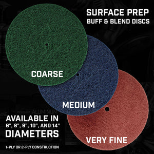 Surface Prep Buff and Blend Discs should be used for moderate surface cleaning and deburring (smoothing) before polishing.