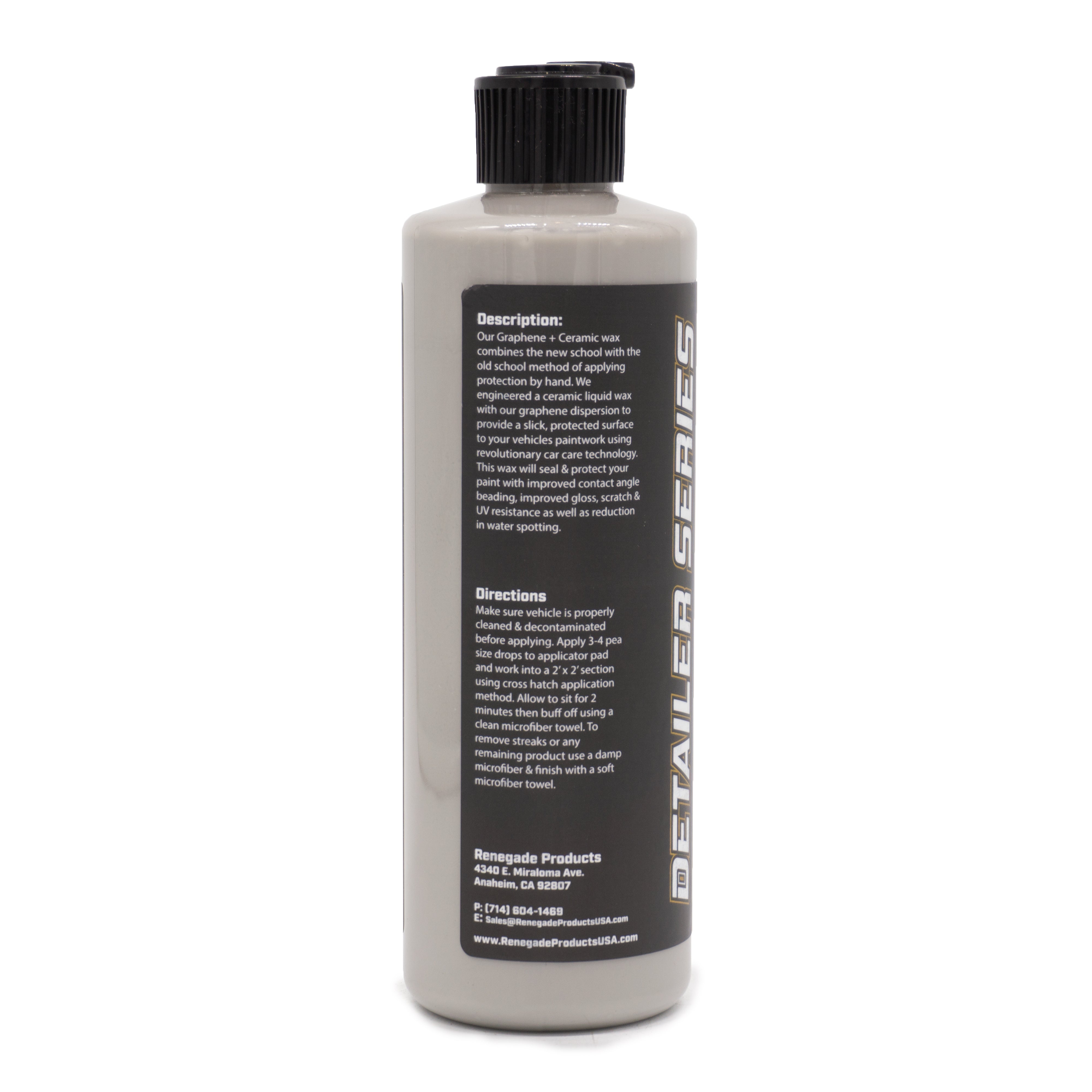 • Bottle of Graphene + Ceramic Wax with labels explaining UV protection, water repellency, and durability benefits for car care.