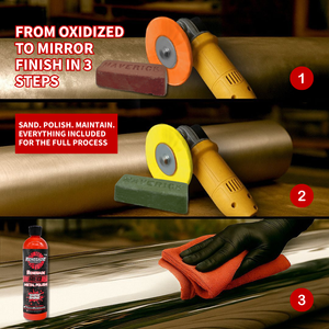 Your first step when polishing an aluminum pontoon boat is to use our 600 grit sanding discs to knock off any surface oxidation from the surface of the boat. This will also help to address minor surface imperfections. Following your 600 grit orbital sand, you'll want to polish on a rotary polishing unit at 3500 RPM. You will pair our Orange Airway Buffing Wheel with the Brown Tripoli compound bar for the cutting stage. For the coloring stage, you will pair our Yellow Airway Buffing Wheel with our True Green polishing compound. As a final step, you may use Renegade Red Liquid Metal Polish in any hard to reach areas the buffer may have missed. Renegade Red is also a perfect hand polish to maintain your finish between high speed polishing sessions. Make sure you get a FULL FACE RESPIRATOR!