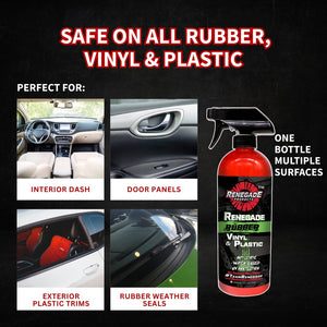 Renegade Rubber, Vinyl, and Plastic is meant to be used to clean and condition the rubber, vinyl, and plastic surfaces of your vehicle--inside and out. It will leave the surfaces pliable, conditioned, and free of any greasy residue. It can be used on your plastic trim, dashboard, center console, and door panels to keep them clean and ensure they don’t lose their shine.